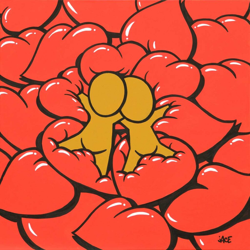 La première partie, la plus importante de l’exposition, est consacrée à l’amour. Pour Jace, dans un monde traversé par la violence et l’incertitude, il ne s’agit ni d’un thème décoratif ni d’un sentiment abstrait, mais d’une nécessité. Le Gouzou s’y fait plus tendre, plus complice, à travers une série de toiles inédites.